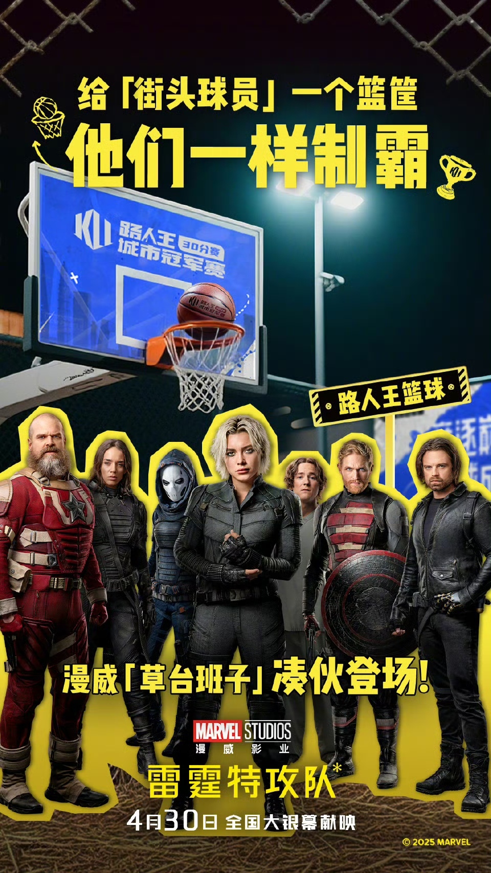 揭幕战期间,漫威影业最新巨制《雷霆特攻队*》联动路人王篮球,前排围观球员们竞逐巅峰、一球成名。当路人王撞上雷霆特攻队,街头单挑点燃银幕激情,燃烧每颗不服输的心。